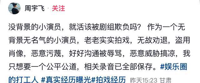 演艺圈并没有想象中那么好混,没有背景,没有资源,即便是你演技再好,也终究会被资本埋没,这并不是所谓的唱衰,而是真实存在演艺圈中的一幕。4月25号,演员周宇飞发视频控诉某剧组,声称
