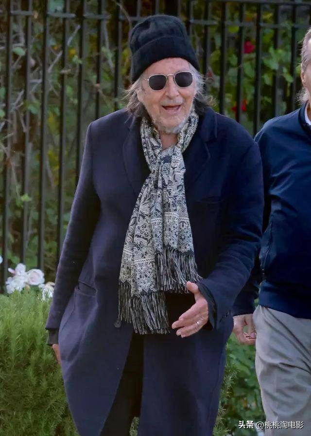 帕西诺走在身旁,穿着深蓝色外套和黑色长裤,同样踩着运动鞋,搭配了他标志性的圆形墨镜、围巾和一顶毛线帽。
