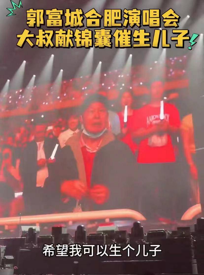 2026年4月26日郭富城在合肥举行演唱会,与粉丝互动的一个环节,一位安徽口音的大爷高声喊话“再生个儿子”,培养成第二代天王,还递上内含“生子秘籍”的锦囊红包。