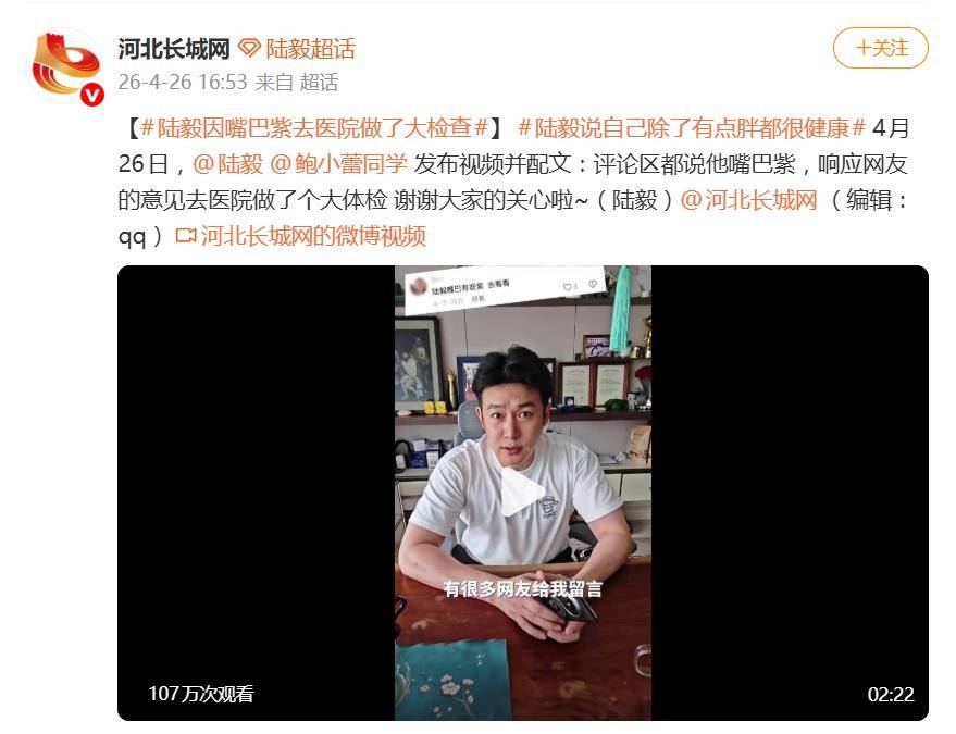 最近,演员陆毅因为“嘴唇发紫”这事儿,直接冲上了热搜。4月26日,他本人发了一条视频,配文写得明明白白:“评论区都说我嘴巴紫,响应网友的意见去医院做了个大体检,