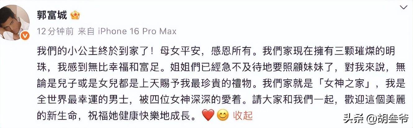 2025年10月22号,郭富城直接在微某博官宣,三胎顺利出生,是个女儿。