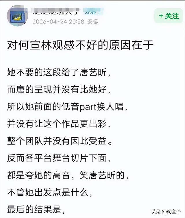 何宣林把难搞的低音甩给唱功一般的唐艺昕,自己挑最出彩的高音,这不就是“队友扛雷,自己独享高光”吗?