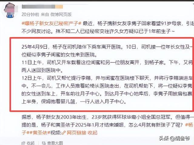 4月27日,知名娱记在微某博突然甩出重磅爆料。杨子和新女友李隽子早就秘密在一起很久,女方还在一年前悄悄生下孩子。消息一出直接冲上热搜前几位,评论区瞬间吵翻了天。大家最关