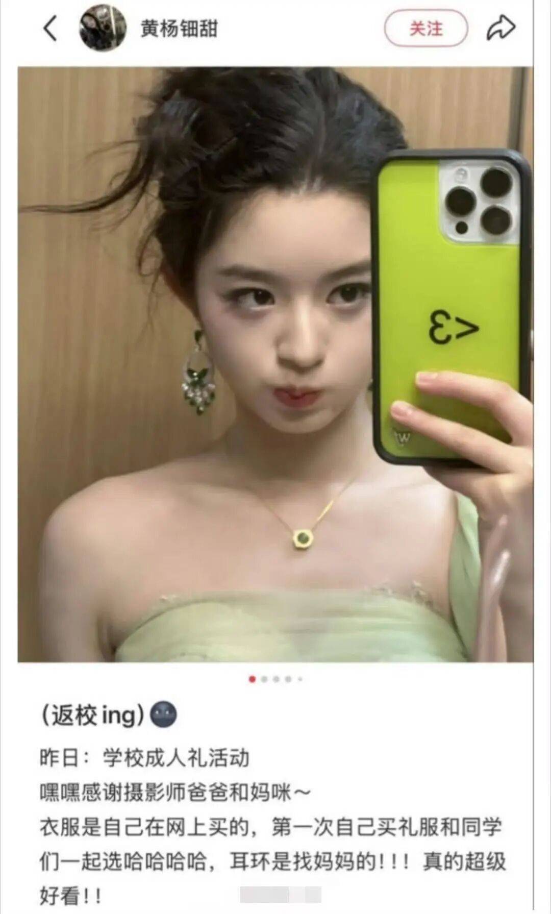 2025年5月,黄杨钿甜在高三成人礼上佩戴一对绿色耳环拍照分享,被网友质疑仿冒奢侈品牌Graff,网传价值230万元,质疑她在炫富。
