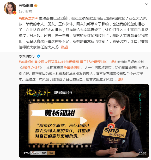 2026年4月27日,演员黄杨钿甜通过个人微博及媒体专访首次正面回应了2025年成人礼佩戴耳环引发的争议风波,她坦言这场风波是“18岁最深刻的一课”,并公开道歉。