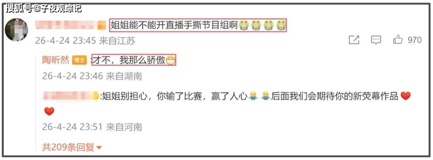 更让我觉得厉害的是,粉丝让她开直播去跟节目组对着干,她直接回了句才不,我那么骄傲,她没有选择撕破脸去博取同情, 而是用非常体面的办法保住了尊严,这并不像是综艺里常见的卖惨那一套,她比赛输了,但赢得分外漂亮,就好像离职的时候不骂前公司、只优雅地说再见的前辈一样。