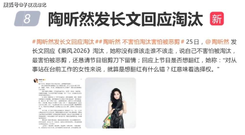 通常来讲,明星被淘汰后,不是卖惨就是发小作文感谢节目组,可陶昕然不一样,在《乘风2026》淘汰之后,她一上来就说想翻红有什么错,这话一出口,我手里的奶茶都停了一下,姐, 你可真敢说。