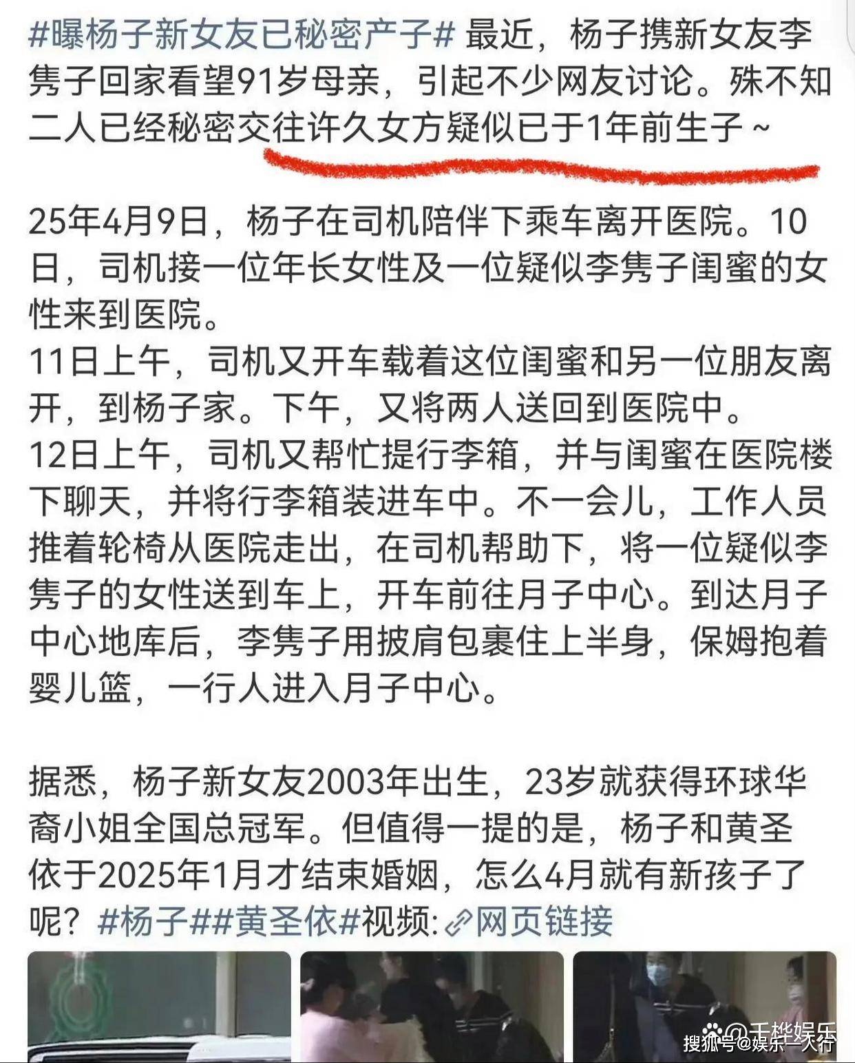 2026年4月27日,狗仔的一则爆料撕开了体面离婚的最后一层遮羞布。 杨子的新女友李隽子,被曝早在一年前就已秘密产子。 时间往前倒推十个月,她的怀孕期,恰好落在杨子与黄圣依法律婚姻的存续期内。