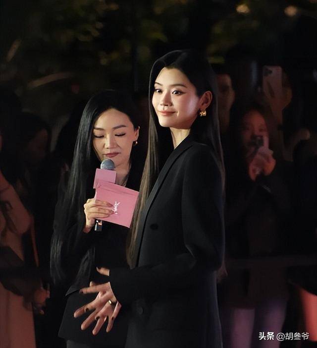 她当天穿黑色深V西装搭配西装裤,看似简单休闲,却把身材优势发挥到极致。