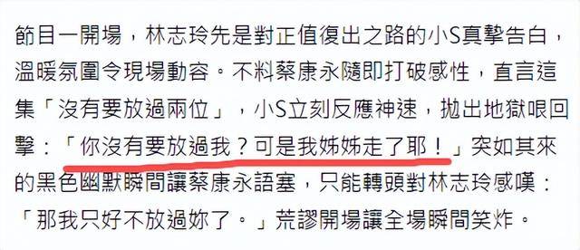 面对老搭档的挑衅,小S直接抛出了一个让人大跌眼镜的 “地狱玩笑”,拿刚离世不久的大S当挡箭牌,说“你没有要放过我?可是我姐姐走了耶!”