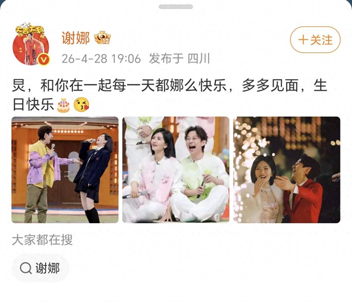 4月28日晚上7点多,谢娜在微博晒出几张与何炅的合照,配文简简单单:“炅,和你在一起每一天都娜么快乐,多多见面,生日快乐。”谐音梗用得恰到好处——“爱炅娜么多”。