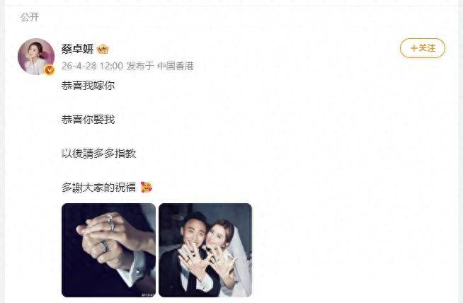 “恭喜我嫁你,恭喜你娶我,以后请多多指教,多谢大家的祝福。”4月28日,43岁的蔡卓妍(阿Sa)在社交平台发布婚讯,配上一张两人对视的婚纱照,铂金钻戒在无名指上闪闪发光。没
