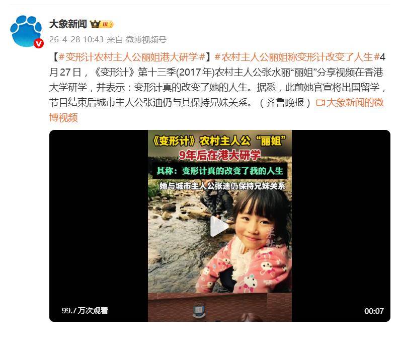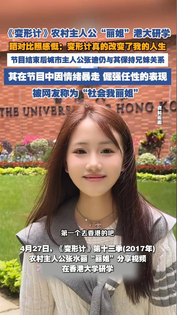 据4月28日报道,一则来自《变形计》第十三季农村主人公张水丽的视频,在社交平台引发了一波回忆杀。视频里,那个曾经蹲在地上嚎啕大哭的小女孩,如今站在香港大学的校园里,微笑着记录自己的研学日常。
