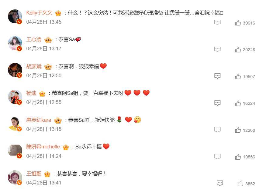 她在阿Sa官宣微博下的留言,堪称“追星族本能反应”的教科书级示范:“什么!?这么突然!可我还没做好心理准备 让我缓一缓…含泪祝幸福”。一连串感叹号配上“含泪祝福”的反差感,瞬间引爆评论区。网友们纷纷调侃:“这是本体吓出来了吧?”“像极了普通人听到好友闪婚的样子。”