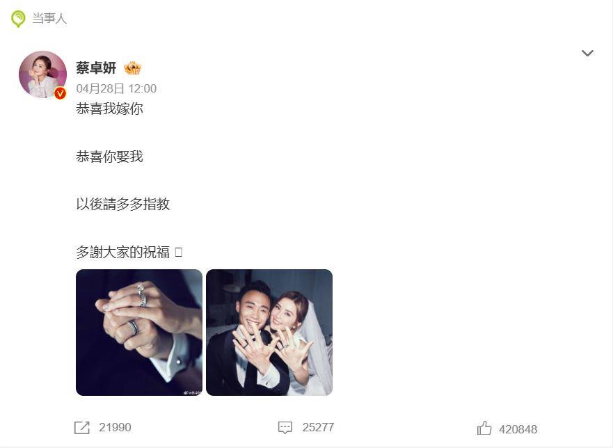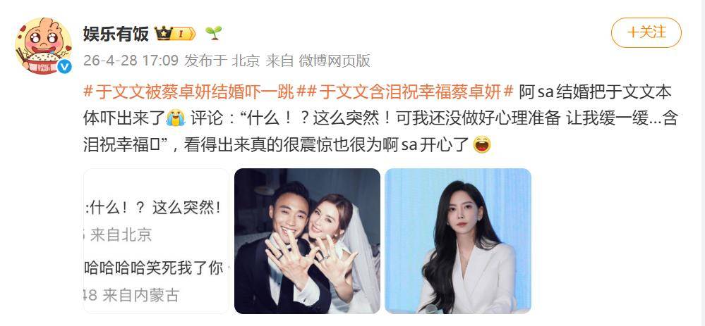 4月28日,蔡卓妍(阿Sa)毫无预兆地在社交平台官宣结婚,直接炸翻了网络。没有预热、没有预告,甚至连圈内好友都一脸懵——其中反应最“出圈”的,当属于文文。
