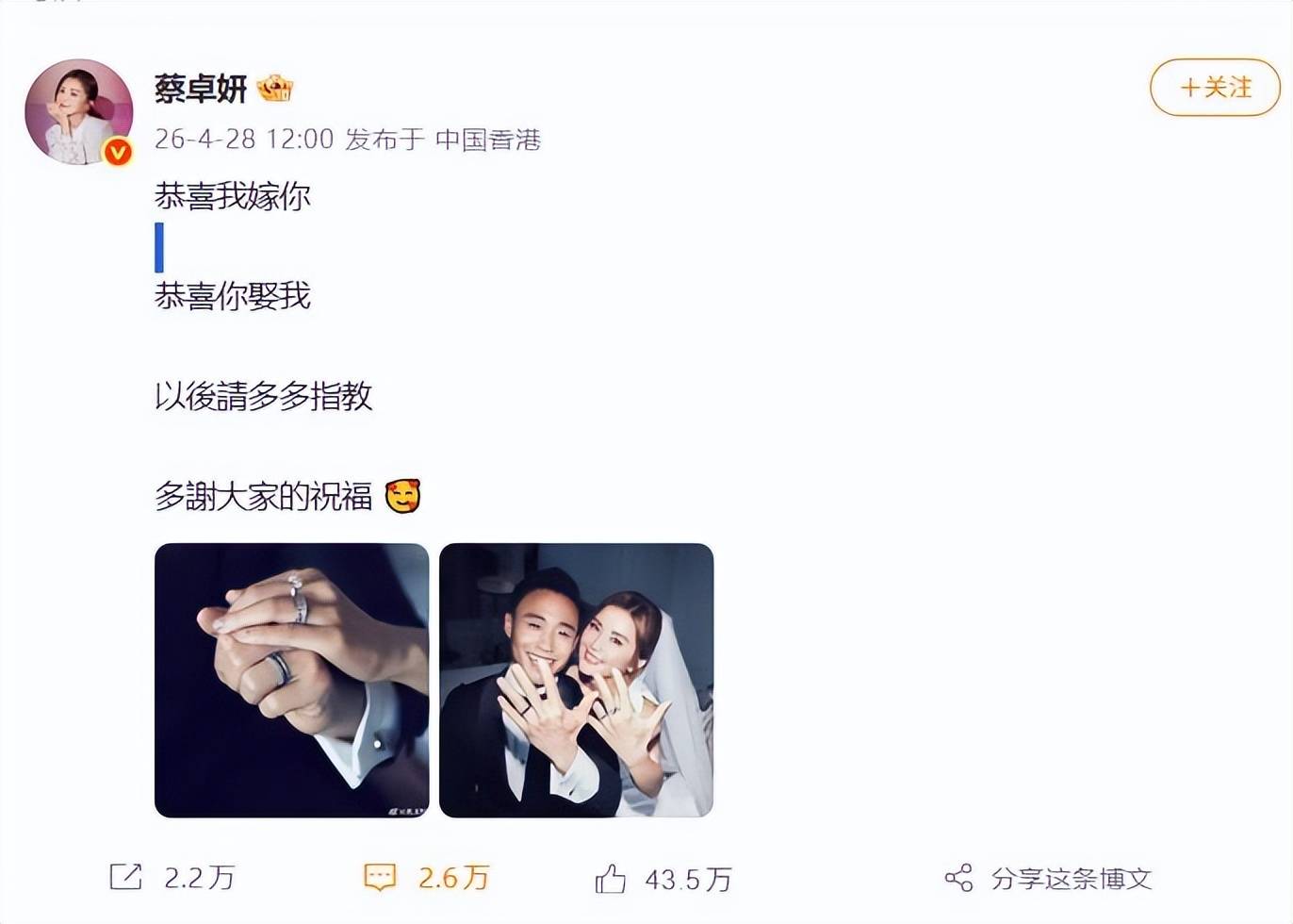 4月28日,蔡卓妍(阿Sa)在微博晒出与小10岁健身教练林俊贤的婚纱照,配文“恭喜我嫁你,恭喜你娶我”,毫无预兆地宣布结婚喜讯,瞬间引爆全网。圈内好友纷纷送上祝福,而歌手于